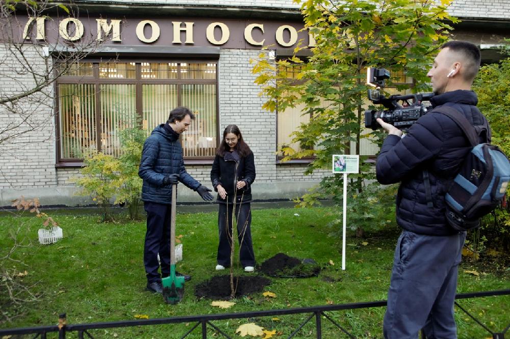 Торжественная посадка прошла в прямом эфире телеканала «Санкт-Петербург». Библиотекарь Дарья Блох рассказала зрителям об истории библиотеки, о сорте сирени и вместе с корреспондентом посадила символический подарок.
