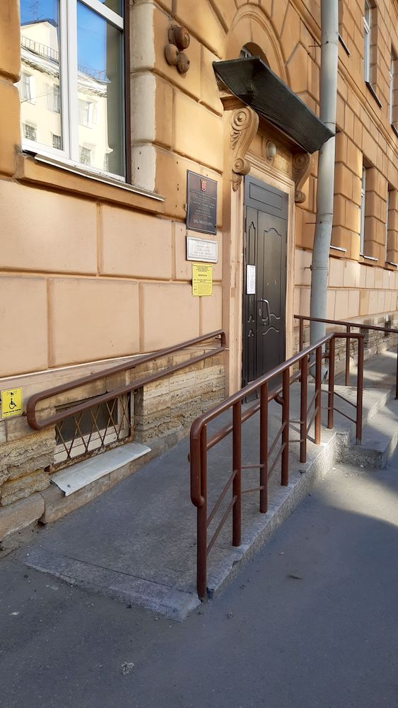 Расстояние от остановки до учреждения составляет около 170 метров. При движении от остановки трамваев, расположенной на нечетной стороне Среднего проспекта В.О., необходимо пройти вперед до пересечения Среднего проспекта В.О. и ул. Гаванская и пересечь ул. Гаванская по пешеходному переходу. Пешеходный переход оборудован занижением бордюрного камня и светофором с цифровым индикатором времени. Далее повернуть направо, двигаться около 80 м к дому 18 по ул. Гаванская, где расположен вход в библиотеку.