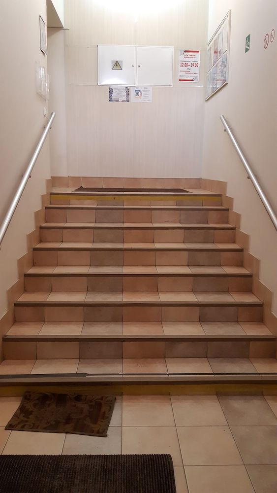 - Наружная лестница главного входа имеет стационарный пандус. Слева от пандуса расположена кнопка вызова сотрудника учреждения для оказания помощи инвалидам всех категорий (сопровождение до места оказания услуги). Кнопка отмечена специальной пиктограммой. Указан номер телефона 352-51-58, по которому можно позвонить для получения помощи.